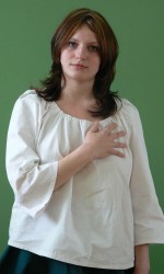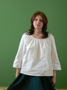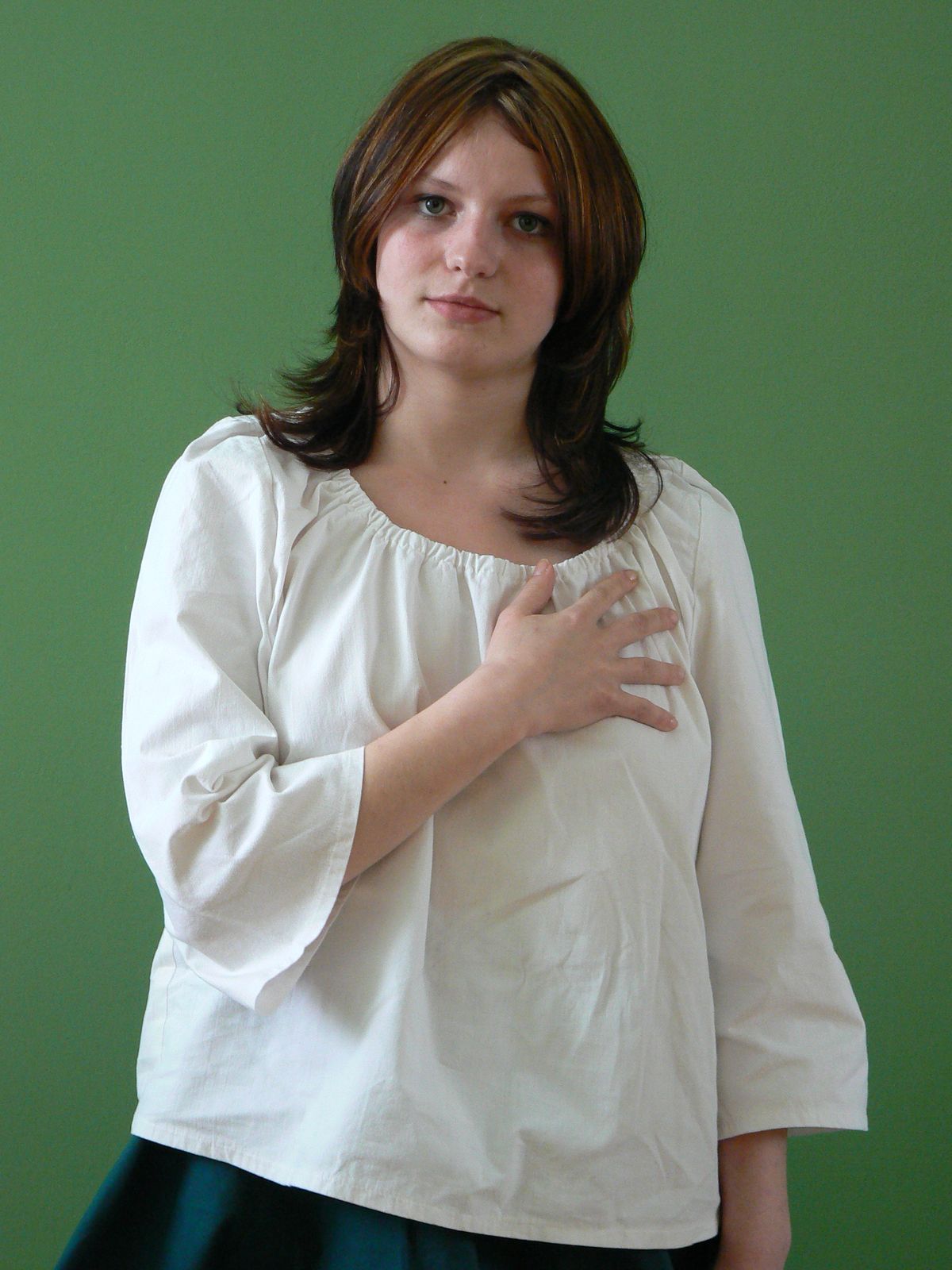 Dlouhá halenka, délka k bokům. U krku guma nebo tkanice.
