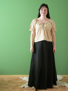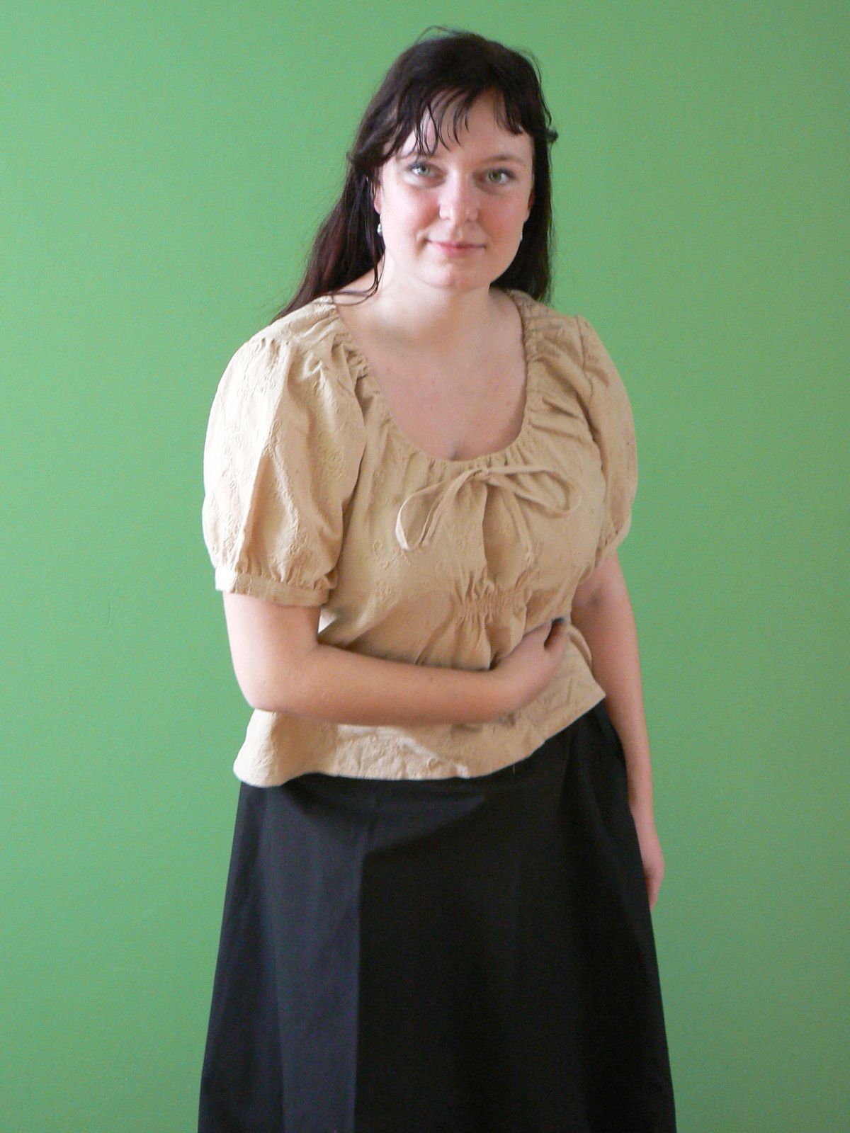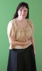 Halenka dlouhá k bokům s krátkým rukávem řaseným do manžetky. U krku do gumy, či tkanička.