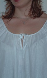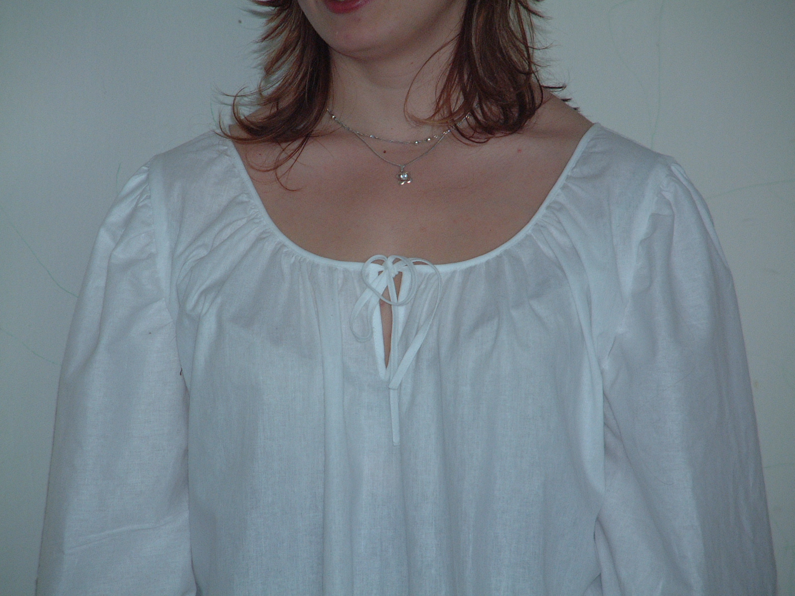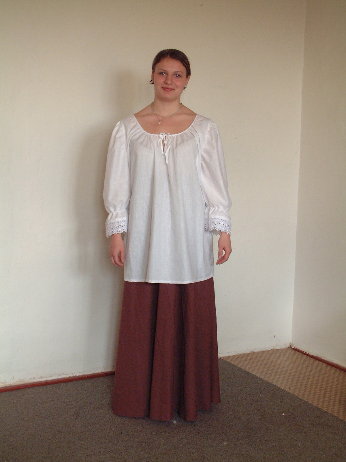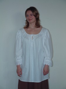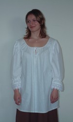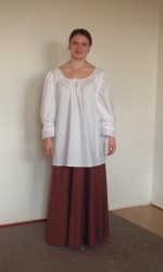 Halenka dlouhá k bokům, u krku vřesná do šikmého proužku na zavazování. Rukáv 3/4ní délka zdobený krajkou.