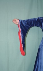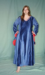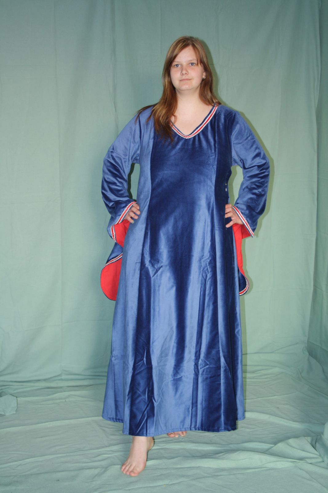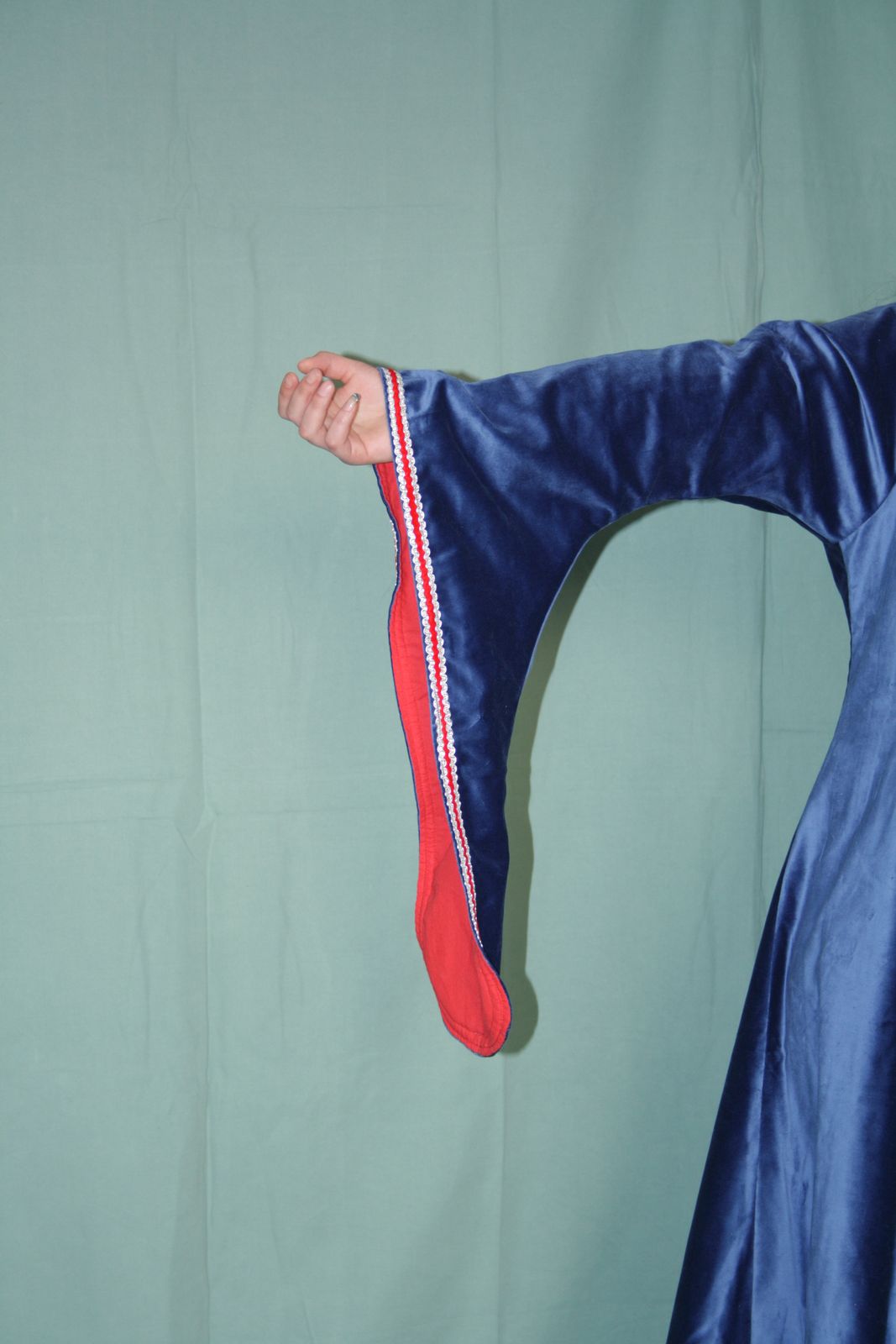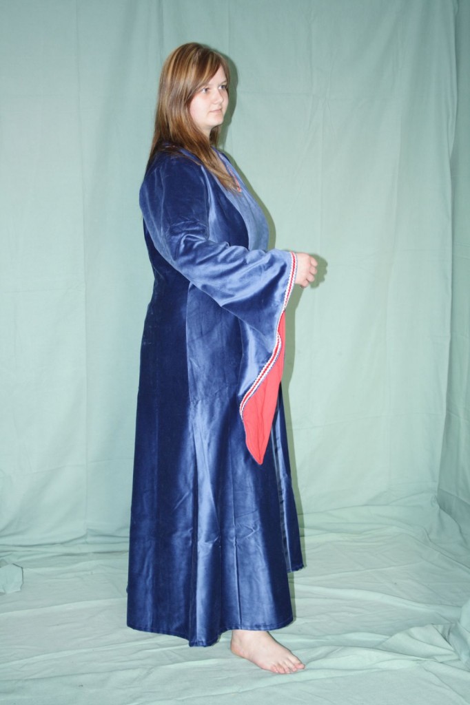 Šaty jsou ušity z bavlněného sametu, nejsou podšity. Jsou volného střihu, nevypasované. Bez šněrování. S dlouhým tvarovaným podšitým rukávem.