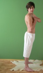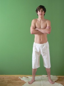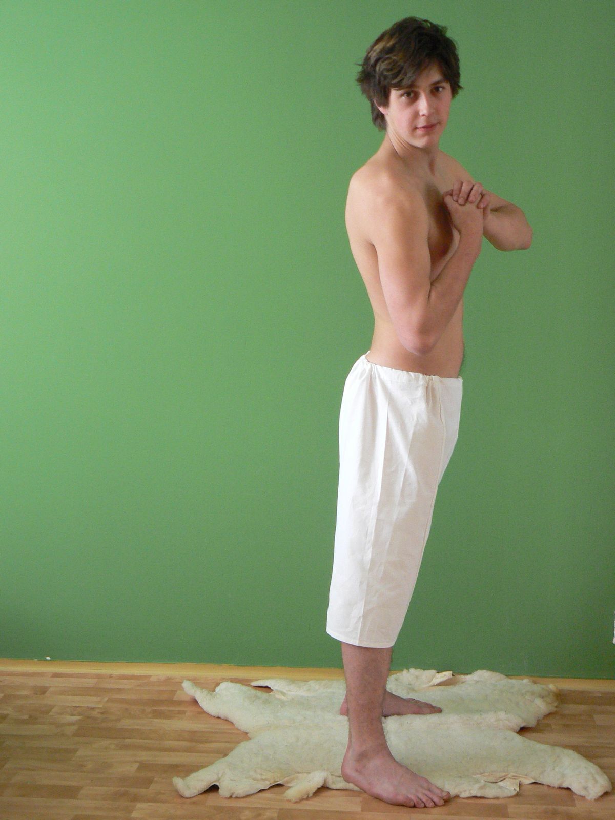 Pánské spodní prádlo. V pase na tkanici, s dírkami pro upevnění nohavic.