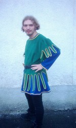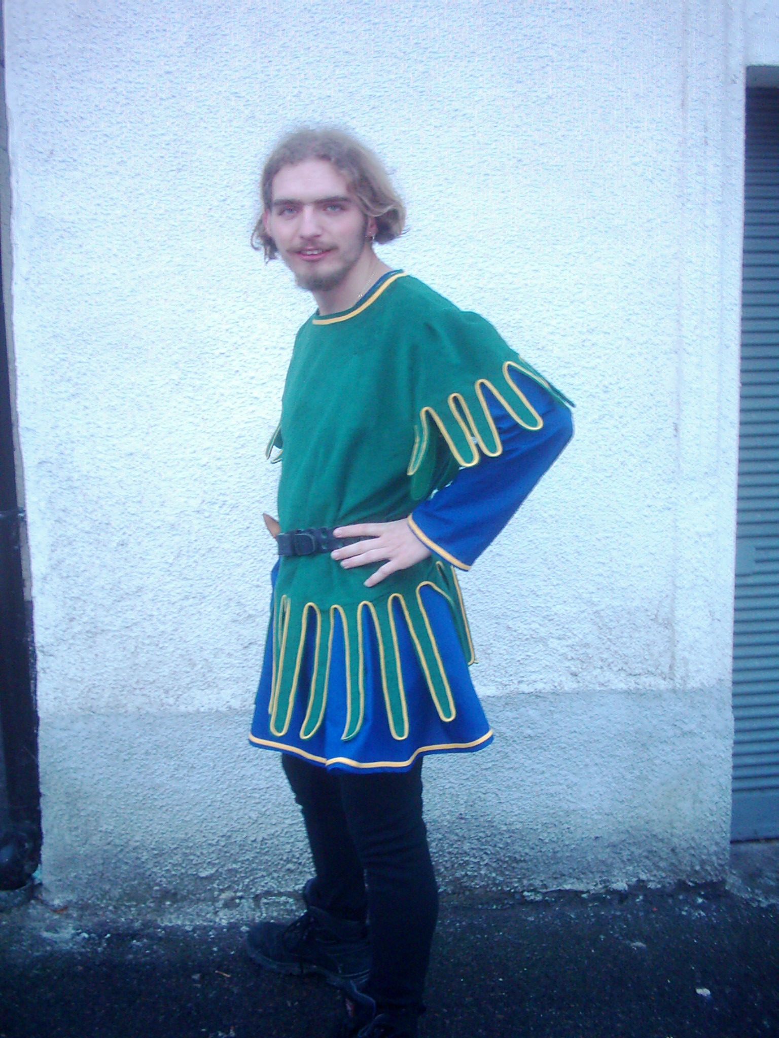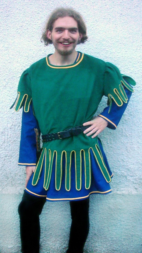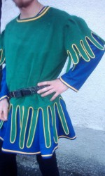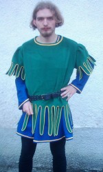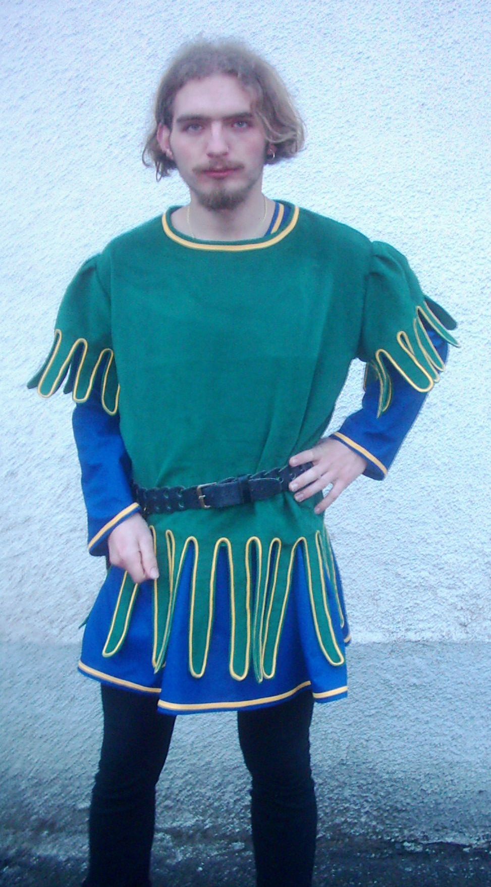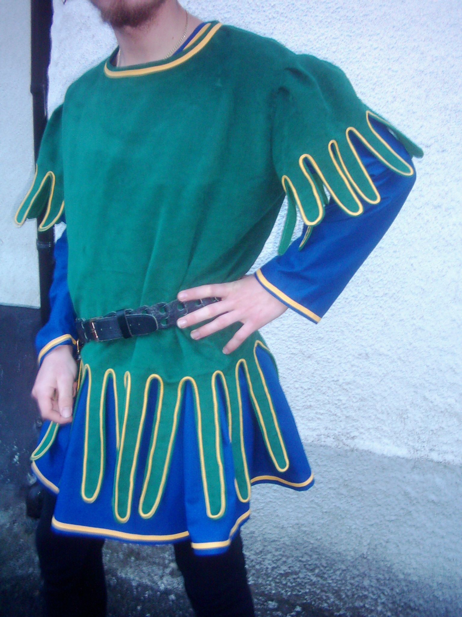 Pánský šat podšitý, tvarovaný, zdobený jednobarevným prýmkem. Součástí kostýmu je vrchní díl a košile.